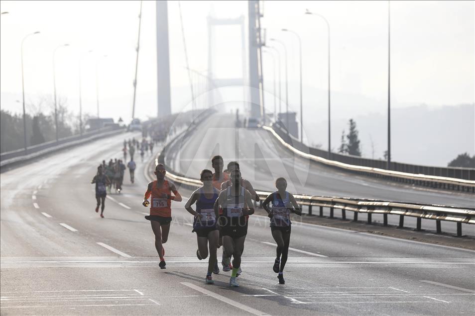 ISTANBUL, TURKEY - NOVEMBER 11: An aerial view of Istanbul’s July 15 Martyrs’ Bridge as hundreds of participants competing in the World's only intercontinental marathon 'Vodafone 40th Istanbul Marathon' in Istanbul, Turkey on November 11, 2018. About 130,000 people, from more than 100 countries, took part in the marathon, with the theme of "Run Istanbul for a healthy future".
