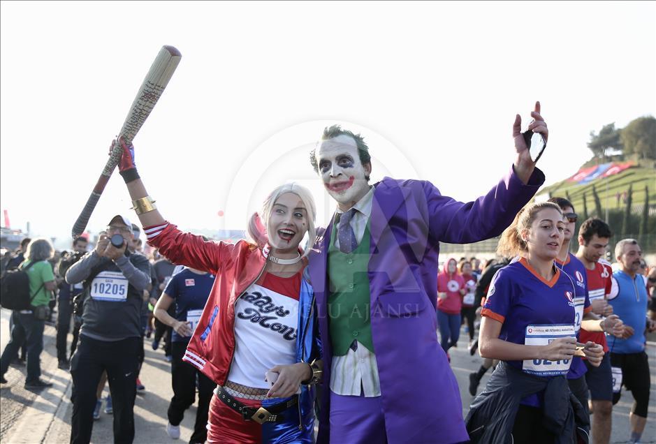 ISTANBUL, TURKEY - NOVEMBER 11: A couple dressed as Harley Quinn and Joker pose for a photo during the World's only intercontinental marathon 'Vodafone 40th Istanbul Marathon' in Istanbul, Turkey on November 11, 2018. About 130,000 people, from more than 100 countries, took part in the marathon, with the theme of "Run Istanbul for a healthy future".