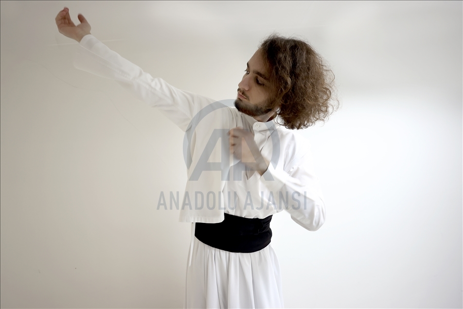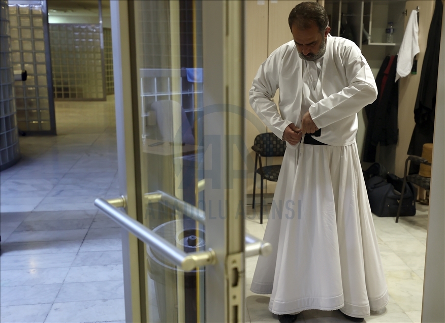 KONYA, TURKEY - DECEMBER 07: A Whirling Dervish (semazen), is seen during his pre-performance rituals and routines before sema ceremony in Konya, Turkey on December 07, 2020. Dignifying all living or non-living things which serve humanity, lie behind the symbolic kiss of the all components of the Dervish costume. A special ritual called Sema, also known as Mevlevi Ayin-i Sherif, is a “whirling” act accompanied by music and characterized by certain rules. The ritual, beginning with “Nat-i Sherif”, a music in praise of Prophet Mohammad, is followed by the entrance of the Semazen, whirling dervishes performing the dance, into the area, with their arms across their chests to the accompaniment of music, usually the reed. As the Semazen begins the whirling ritual, they take off the waistcoat, as an indication for stepping into purification, deserting the ego aside. As a ritual full of symbols, everything, from acts to clothes, bears a meaning in Sema. For instance, the Semahane (Ritual Quarters) has a round floor to represent the universe; the post on which the Sheikh, the leader of the ritual, is red as a symbol for the sunset, the time of the day Rumi united with God. The post, a beginner of Mevlevi Order sit on, is black. In his “journey of enlightenment”, the new initiate comes to earn a white “post”. As they whirl, the semazens, dressed in a symbolic costume of white robes and a conical hat called a sikke, open both arms to the sides and whirl in a counter-clockwise direction, like an embracement of the entire universe. The right hand with an open palm extended upwards indicates reception from God, passage through the heart’s path. The left hand with the palm extended downwards indicates fair distribution among fellow men. At this point, there is also emphasis on the dervish’s dissolving into divine existence. Described as one of the most exquisite ceremonies of spirituality, the whirling of the dervishes is an act of love and faith possessing a highly-structured form. ( Abdullah Coşkun - Anadolu Agency )Abdullah Coşkun