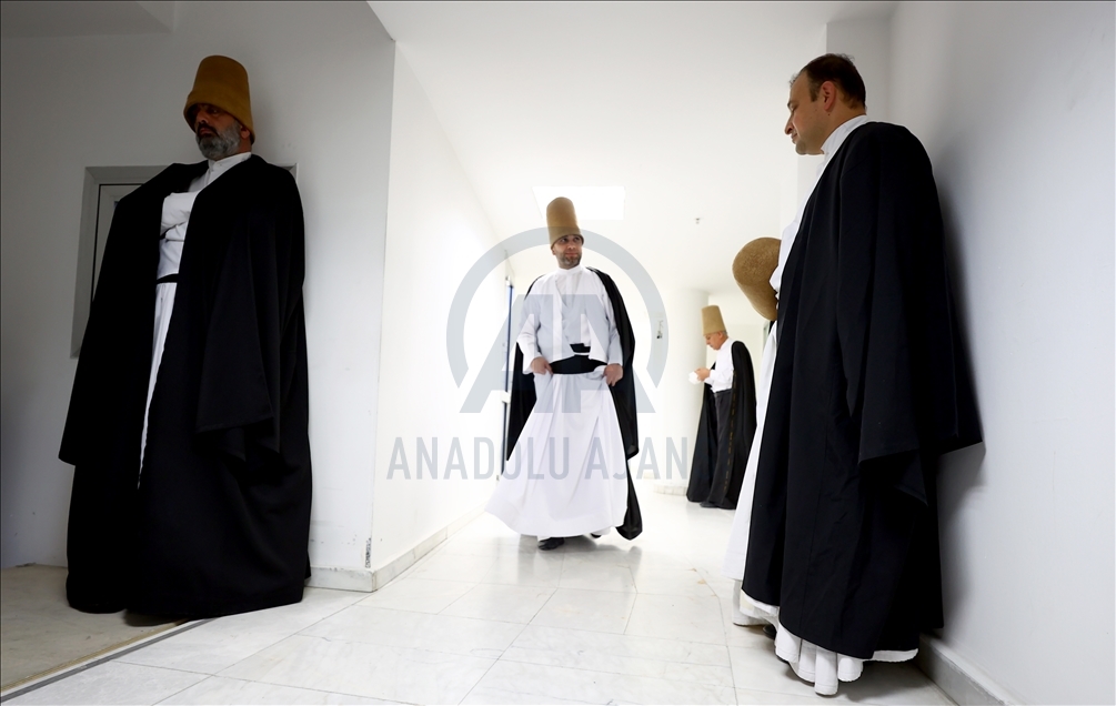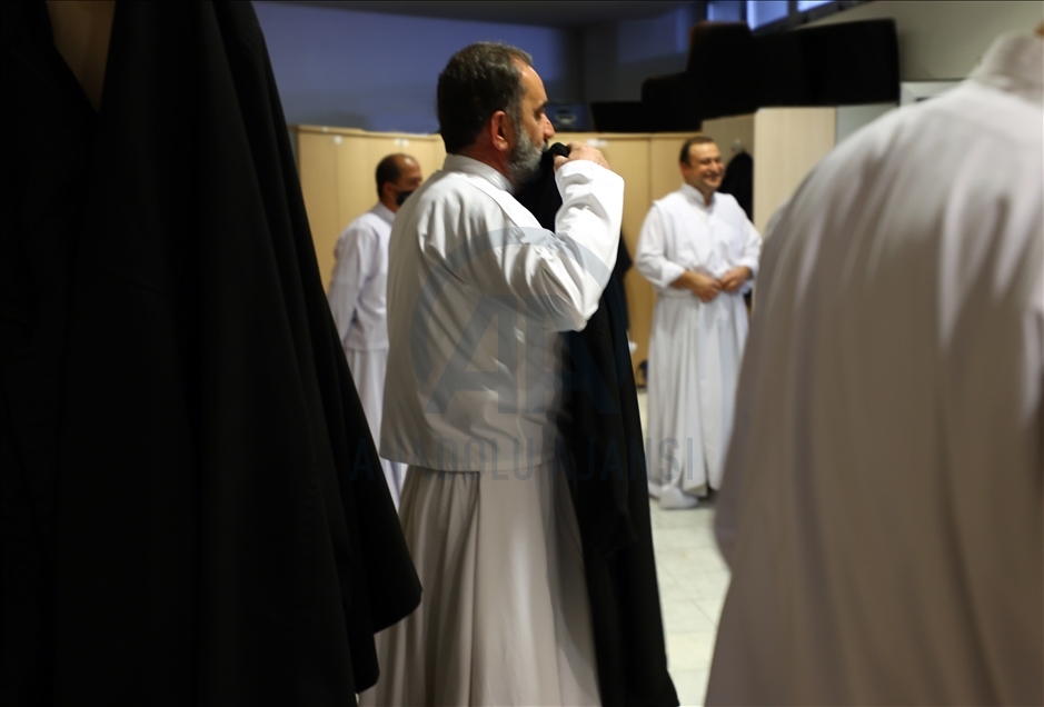 Whirling Dervishes (semazen), are seen during their pre-performance rituals and routines before sema ceremony in Konya, Turkey on December 07, 2020.