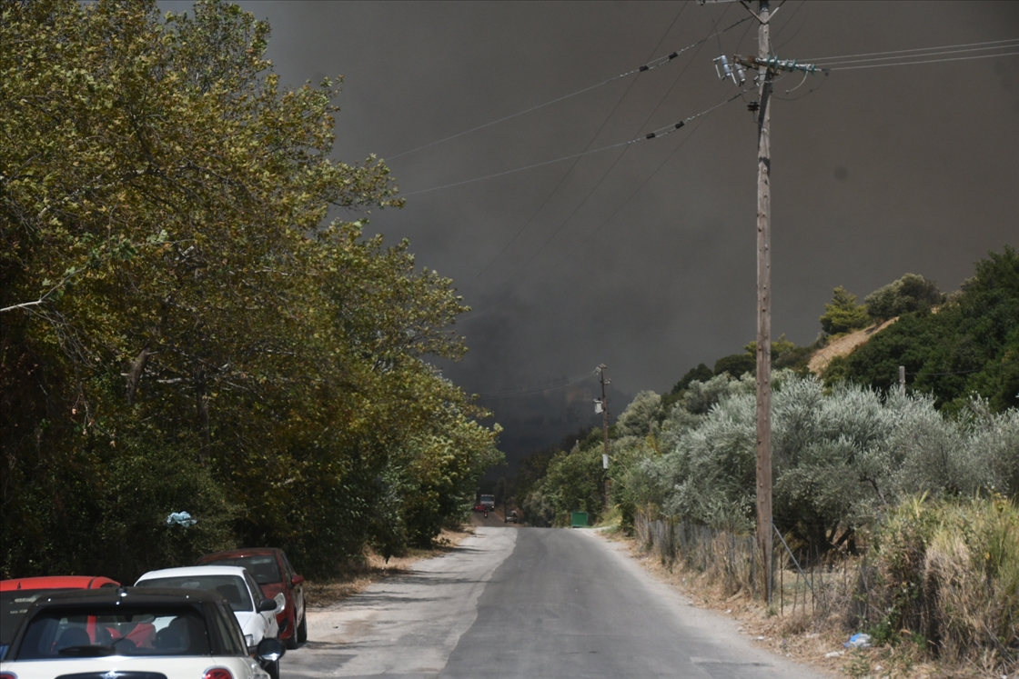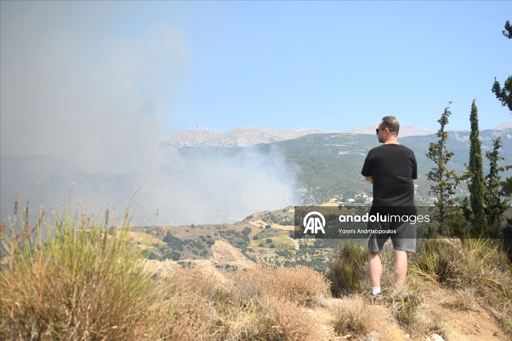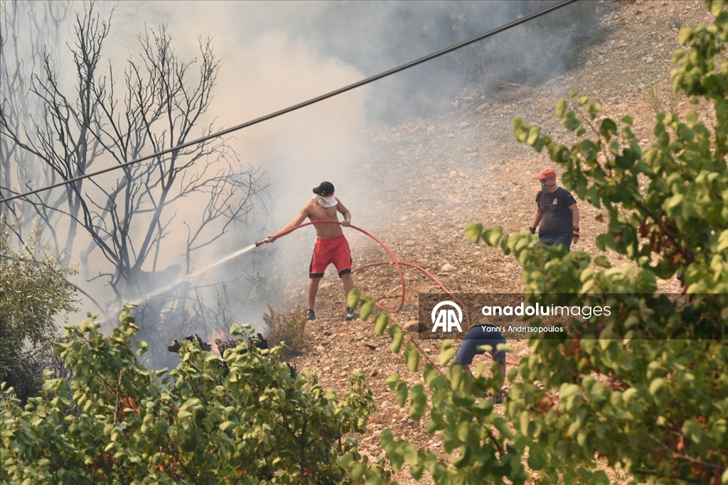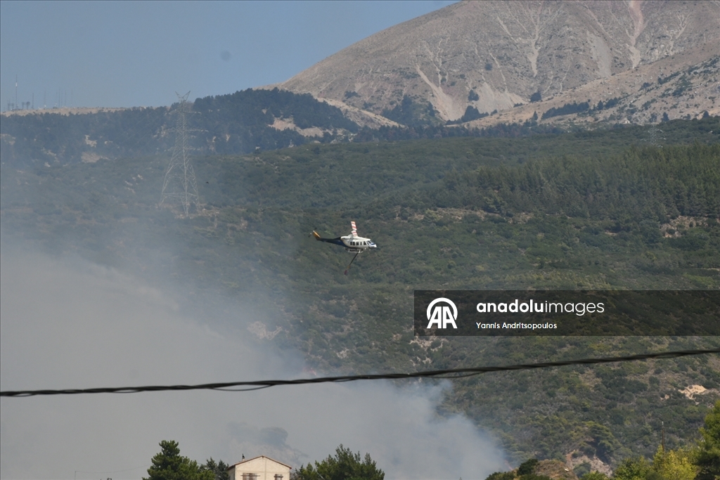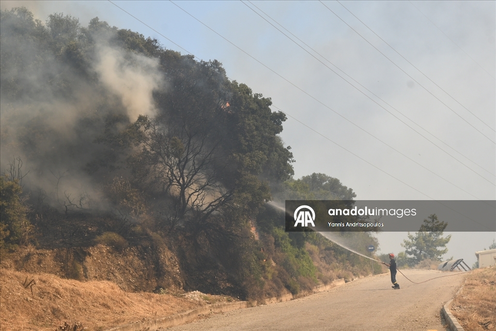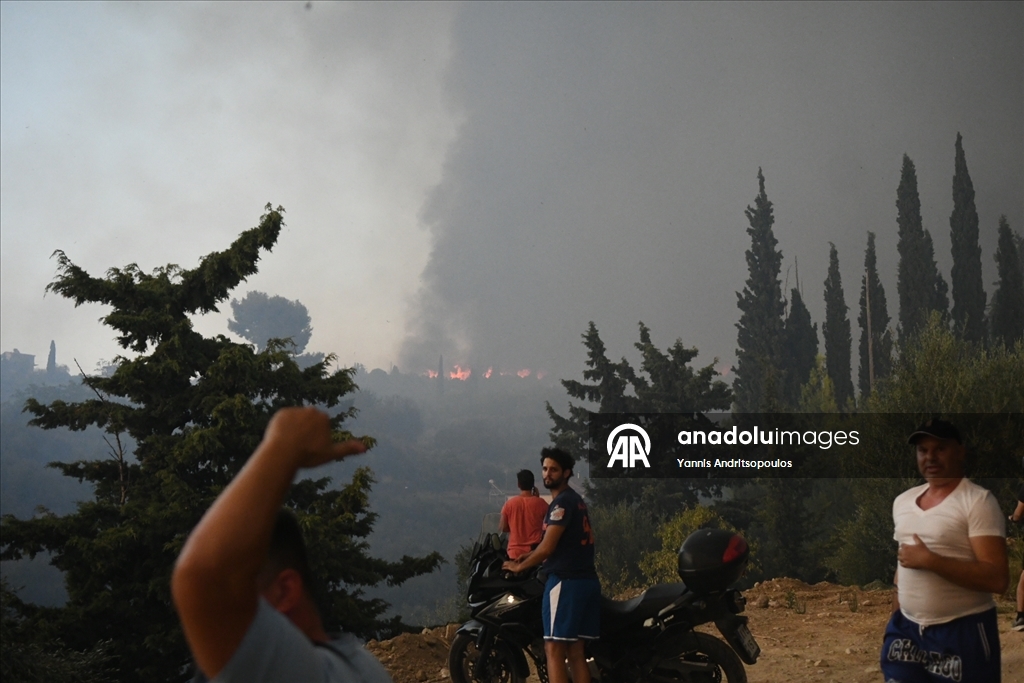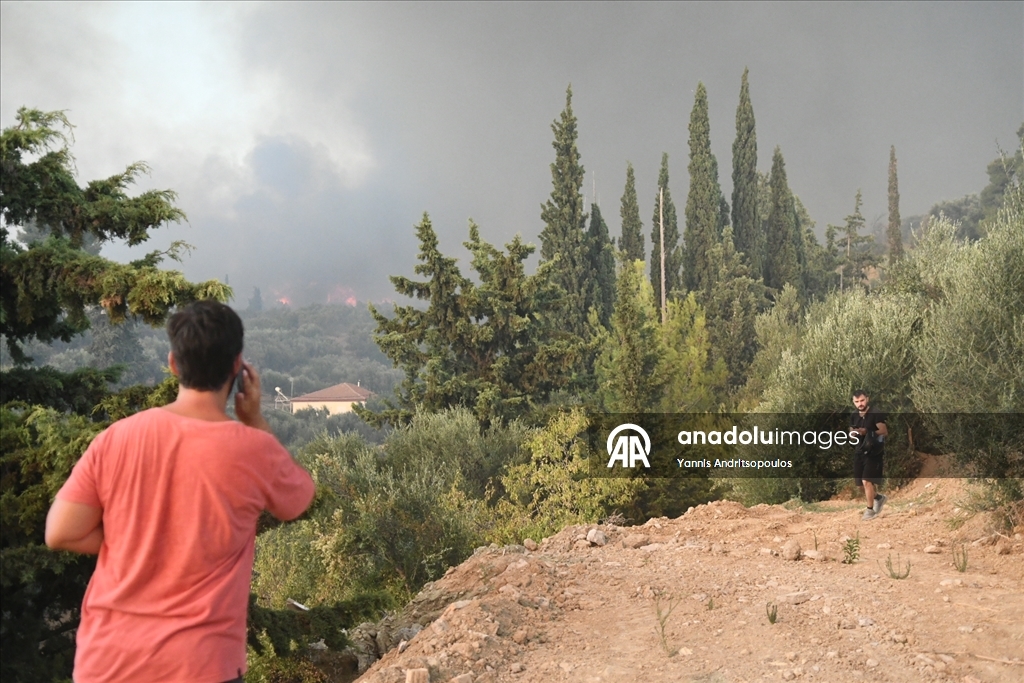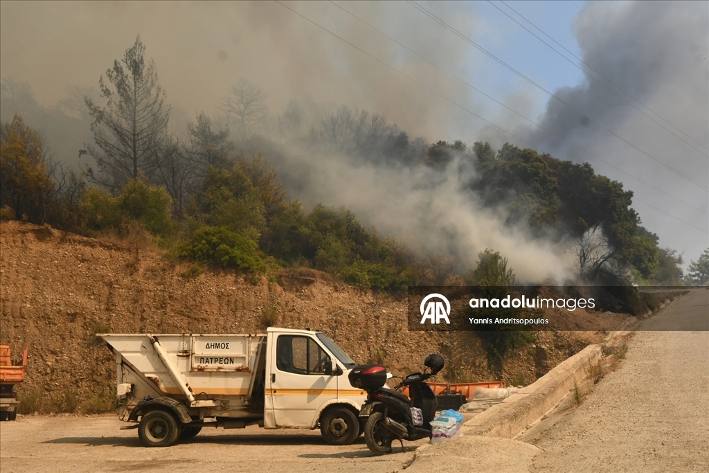 Smoke rises from the wildfires as locals and firefighters continue to battle multiple wildfires on the second day, with blazes threatening villages and towns near the western city of Patras, Greece