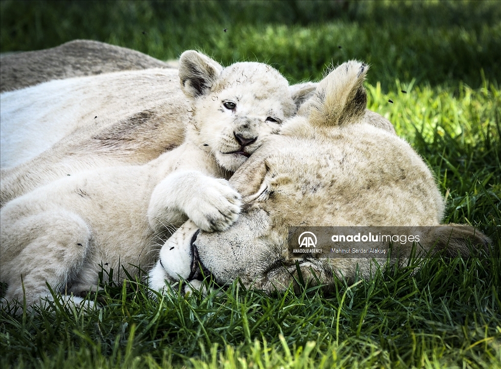 JOHANNESBURG, SOUTH AFRICA - NOVEMBER 20: White lion cub lies down beside his mother at the Lion Park, situated 35 km away from Johannesburg, South Africa on November 20, 2014. The Lion Park provide opportunity for tourists to learn more about African animals and visitors could do a game drive or drive themselves around the park. ( Mahmut Serdar Alakuş - Anadolu Agency )Mahmut Serdar Alakuş