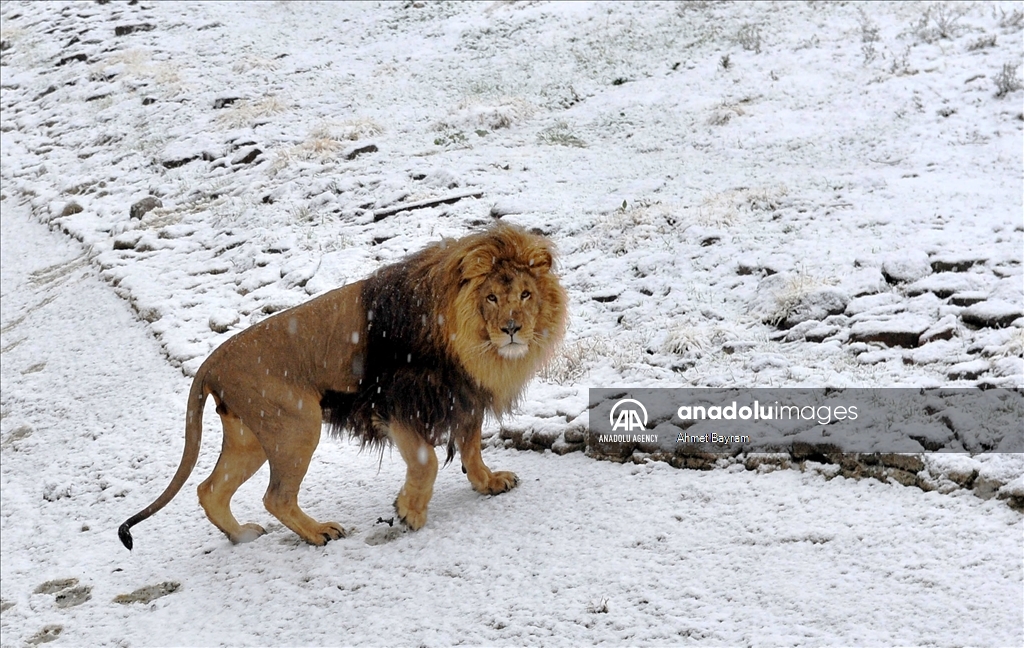 TIZMIR, TURKEY - JANUARY 10: A lion is seen on a snow covered area at Izmir Wild Life Park in Izmir, Turkey on January 10, 2017. Izmir Wild Life Park, which lies on 425,000 sq.mt of land, is home to more than 1500 animals of over 120 different species. Animals, which are used to warm winter seasons of Izmir, walked on the snow covered areas. ( Ahmet Bayram - Anadolu Agency )Ahmet Bayram