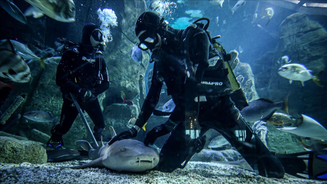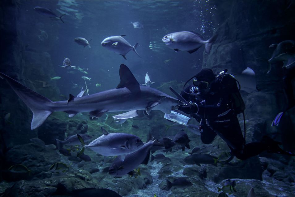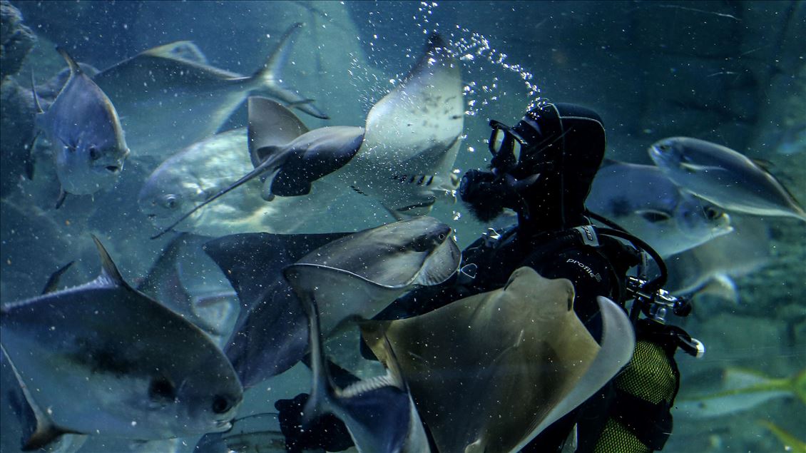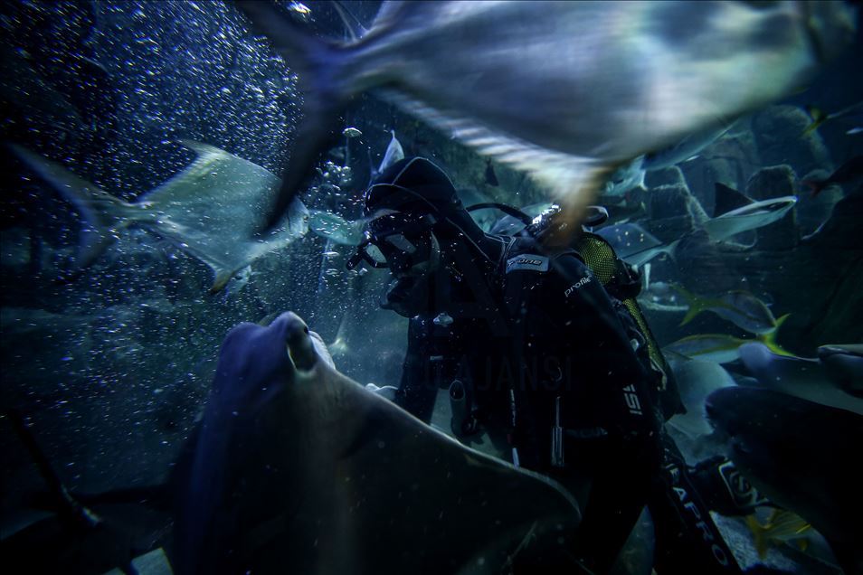 Divers are seen with fishes in a thematic pool at Istanbul Aquarium, the biggest thematic aquarium in the world, in Istanbul, Turkey on January 21, 2020. The Aquarium has 17 themes and 1 Amazon Rain Forest extending from the Black Sea to the Pacific, Istanbul Aquarium.
