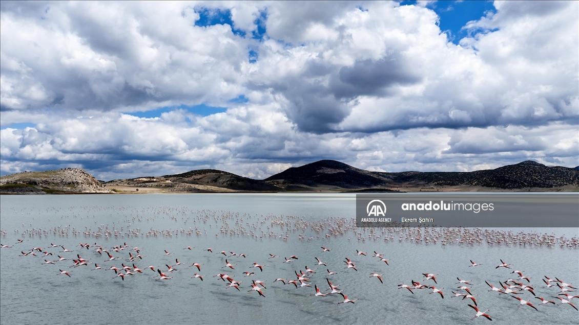 BURDUR, TURKIYE - APRIL 14: Flamingos fly over the Yarisli Lake, which is one of the smallest lake in Lake district and among the stops of migratory birds in Burdur, Turkiye on April 14, 2025. Seasonal recession is observed in the lake, which is fed by the water descending from the surrounding area and precipitation, due to drought, evaporation and drilling in the area. Lake Yarisli attracts attention with its appearance due to its alkaline and salty water and rich biodiversity, ( Ekrem Şahin - Anadolu Agency )Ekrem Şahin