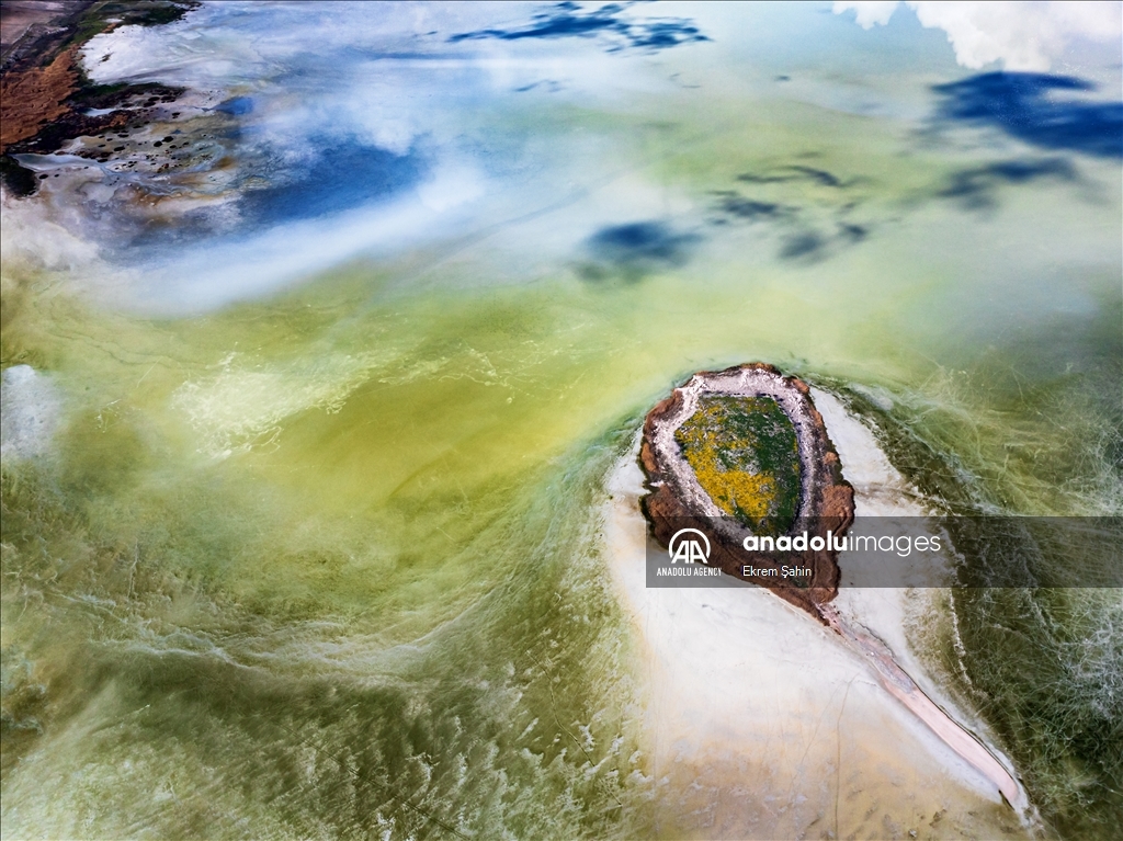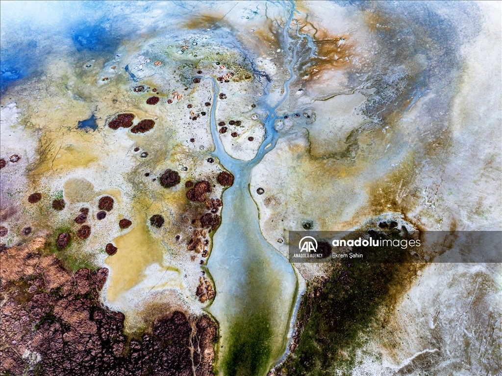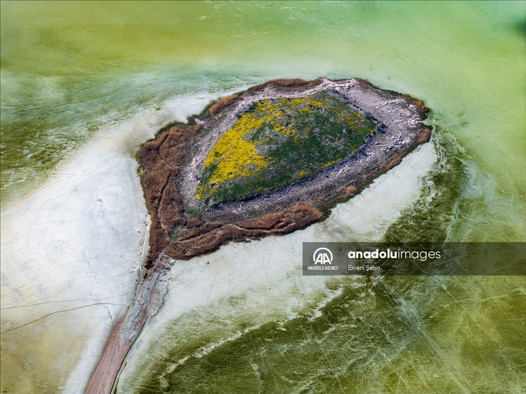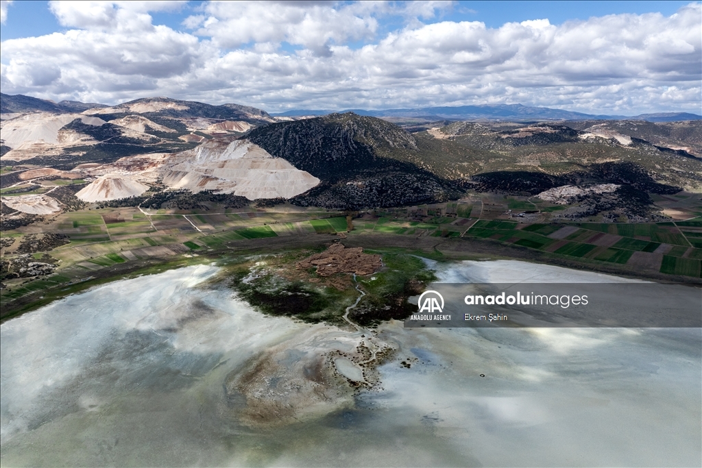 BURDUR, TURKIYE - APRIL 14: An aerial view of the Yarisli Lake, which is one of the smallest lake in Lake district and among the stops of migratory birds in Burdur, Turkiye on April 14, 2025. Seasonal recession is observed in the lake, which is fed by the water descending from the surrounding area and precipitation, due to drought, evaporation and drilling in the area. Lake Yarisli attracts attention with its appearance due to its alkaline and salty water and rich biodiversity, ( Ekrem Şahin - Anadolu Agency )Ekrem Şahin