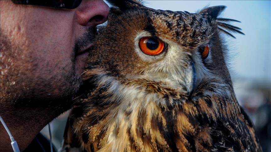 KUWAIT CITY, KUWAIT - FEBRUARY 18: An eagle owl stands on the arm of its owner during an event at which species of owls are being displayed for enthusiasts in Sughan area of Kuwait City on February 18, 2017. ( Jaber Abdulkhaleg - Anadolu Agency )Jaber Abdulkhaleg