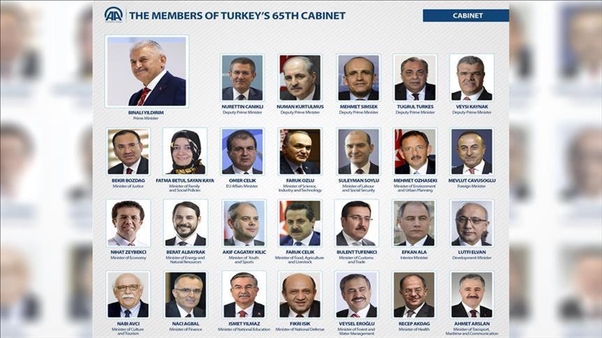 Incoming prime minister and chairman of Turkey's ruling Justice and Development (AK) Party, Binali Yildirim, has revealed the country’s 65th cabinet on Tuesday.
