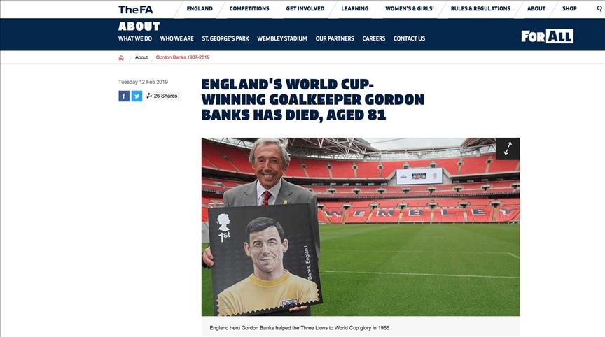 "We’re deeply saddened to hear that Gordon Banks, our World Cup-winning goalkeeper, has passed away. Our thoughts are with Gordon’s friends, family and supporters at this difficult time," the English football team said in a tweet.