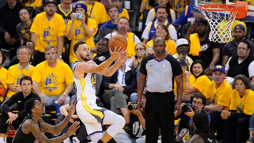 The American playmaker guard of Warriors was sandwiched between two Phoenix Suns players while he was driving to the rim.