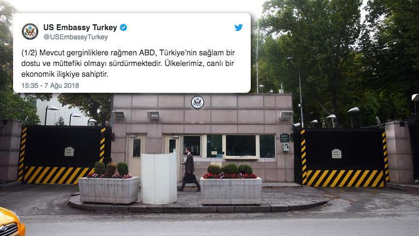 "Despite the current tensions, the United States remains a stalwart friend and ally to Turkey; our two nations enjoy a vibrant economic relationship," said the Embassy on its Twitter account.