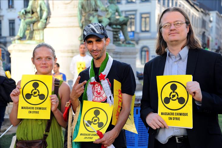 European Union (EU) was protested in Belgium's capital Brussels for staying nonreactive against the massacres in both Egypt and Syria.