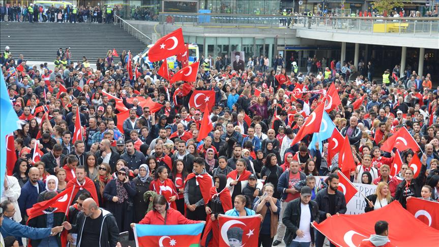 The protest, organized by Sweden Eurasia Association in Stockholm’s Segeltorp Square, was attended by Turks from Balkan states, Azeri citizens, Uighurs, and Iraqi Turkmen, among others.