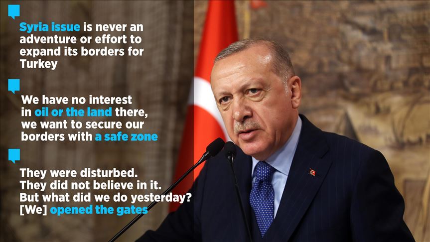 Turkey is not in Syria for an “adventure” or to expand its borders, President Recep Tayyip Erdogan said on Saturday.