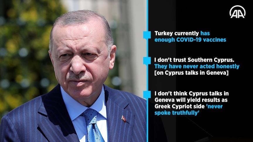 Turning to this week’s informal Cyprus talks in Geneva, Erdogan said about the Greek Cypriot administration of Southern Cyprus: "I don't trust or believe Southern Cyprus. They have never acted honestly."