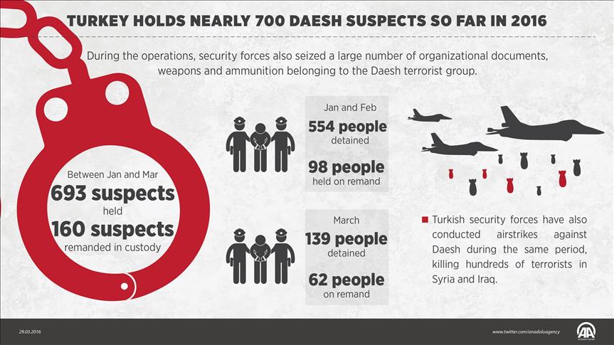Nearly 700 suspected Daesh members have been detained in nationwide anti-terrorist operations since the beginning of 2016, according to data compiled by Anadolu Agency.