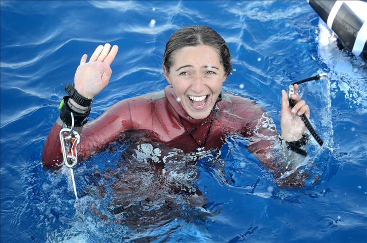 Turkish athlete Sahika Ercumen on Thursday broke a second world record in "skin diving without fins rope guided" dive at the sea off Kas in Turkey's Mediterranean coastal town Antalya.