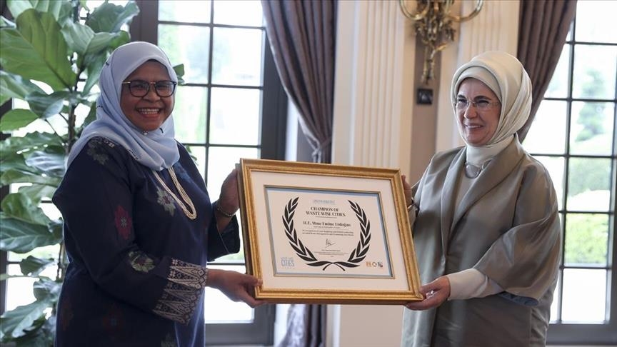 At a ceremony in the capital, Ankara, Maimunah Mohd Sharif, executive director of the United Nations Human Settlements Programme (UN-Habitat), presented the award to Emine Erdogan for her contributions to the Waste Wise Cities initiative and healthy environment as well as Turkey's Zero Waste Project that she led.