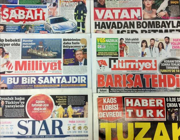 Most Turkish dailies on Wednesday cover the demonstrations in many cities around Turkey in support of the presence of the outlawed Kurdistan Workers’ Party, or PKK , in the Syrian town of Kobani and Turkish President Recep Tayyip Erdogan’s address to Syrian refugees during a visit to camps in Turkey’s southern Gaziantep province on Tuesday.