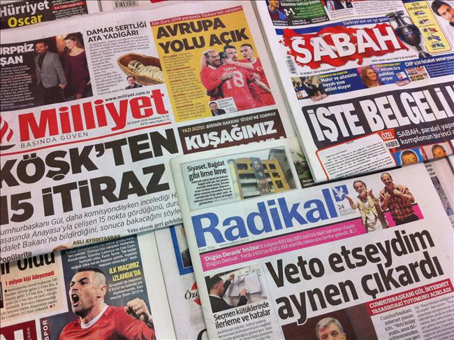 Turkish dailies cover President Abdullah Gul's remarks on the recent judicial reform along with another law on Internet regulations. Daily Milliyet's headline is "15 objections from the (Presidential) Palace," with the daily quoting Gul as saying the law on the Supreme Board of Judges and Prosecutors (HSYK) containes 15 instances of constitutional violation.
