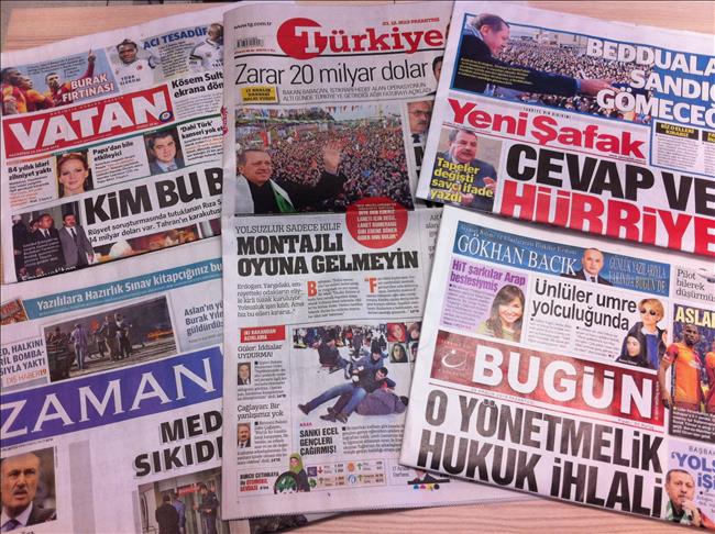Turkish dailies on Monday cover Turkish Prime Minister Erdogan’s statements during his visits to several provinces in northern Turkey in the weekend, the latest developments in the Istanbul-based anti-graft operation which rattled the country last week and Galatasaray’s 2-1 victory against Trabzonspor in the Turkish football league.