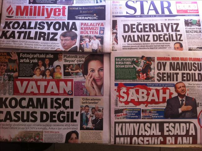 Turkish dailies covered on Monday efforts to devise a joint international response to reports of use of chemical weapons in Syria, the Syrian regime's go-ahead for a UN chemical probe at the site of a deadly poison gas attack in suburbs of capital Damascus, Turkish Prime Minister Recep Tayyip Erdogan's remarks on Egypt, a claim about weapons transfer to the Syrian opposition from Turkey, fatal traffic accidents in Turkey over the weekend, and issuance of a red notice for the arrest of a machete-wielding man from Turkey's Gezi Park protests.