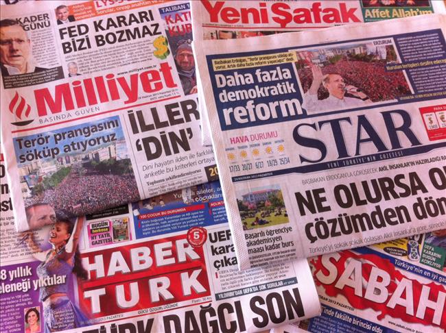All of the dailies covered Turkish Prime Minister Recep Tayyip Erdogan's rallies in northern province of Samsun and eastern province of Erzurum at the weekend. "Higher number of democratic reforms" headlined daily STAR and quoted Erdogan as saying "Now that we will completely get rid of the terror problem soon, we can carry out more reforms." The daily also cited Erdogan as saying "21st century will be Turkey's with its fast growing economy." Support for Erdogan in all over the world is growing each day, daily YENI SAFAK said. The daily reminded the sympathy rally in Austria's capital Vienna held Sunday by more than 10 thousand people to support Erdogan in Gezi Park protests. Referring his speech in Erzurum on Sunday, daily SABAH quoted Erdogan as saying "Those who claim to be socialists are now relaxing in their yachts. If you are looking for social justice, you can find it in AK Party." Daily ZAMAN quoted the prime minister as saying "The solution process does not mean 'giving in', it is a struggle for democracy."