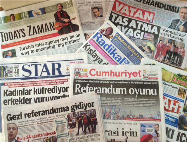 All Turkish dailies covered on Thursday the possible referendum over the Gezi Park. Daily SABAH headlined "A referendum for Gezi Park", while HABER TURK reported that after a meeting between Prime Minister Recep Tayyip Erdogan and a delegation of 11 people from the Gezi Park protesters, "We can hold a referendum on Gezi Park". Daily TARAF covered that after a 5 hours long meeting between PM Erdogan and the Gezi Park delegation the PM proposed to hold a referendum. Daily CUMHURIYET said that the referendum was a 'trick'. Daily RADIKAL covered also the referendum with the headline, "Democracy to the barracks" with a reference to the Topcu barracks which should be pulled down. RADIKAL columnist Tarhan Erdem said, "This is the first time something like that will be asked to the people."