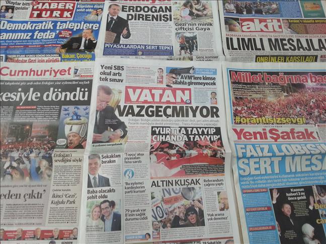 Turkish dailies on Friday covered Prime Minister Recep Tayyip Erdogan's evaluations of Gezi Park protests on the way back from his 4-day North Africa visit, the effects of the protests on the Turkish markets and reactions of business world to the effects, approval of the bill of indictment for the case related to February 28 military memorandum and the reveal of US National Security Agency's phone data program monitoring the phone records of Americans.
