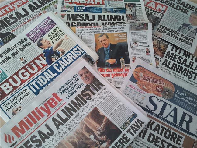 All of the Turkish dailies covered Turkish President Abdullah Gul's statement that "the messages given with well intentions were understood" and his call for restraint to the Turkish people.
