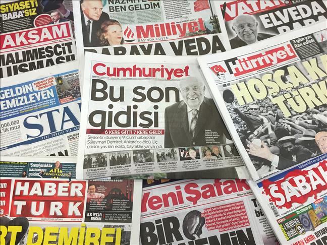 All Turkish dailies devoted their Thursday first pages to the death of the country's ninth president, Suleyman Demirel, who once escaped an assassination attempt and went through a military coup.
