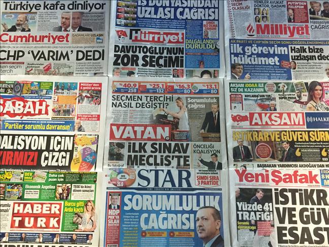 Post-election scenarios -- together with remarks by Turkish President Recep Tayyip Erdogan, Prime Minister Ahmet Davutoglu and other political party leaders -- have made headlines across the majority of Tuesday’s newspapers.