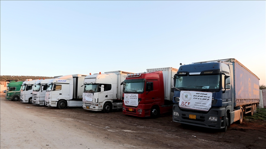 The trucks, carrying first aid materials, food, and tents, entered the Babusselam Border Gate in Azaz through the Oncupinar Border Gate in Türkiye's southern Kilis province.