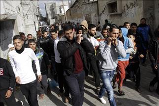 Scores of young people staged a march at the camp's entrance to denounce Wednesday's killing of a young Palestinian man as he worked on a road-maintenance project in Ramallah.