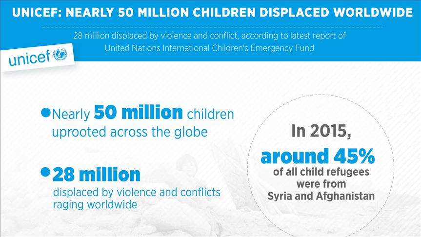 Nearly 50 million children have been uprooted across the globe, 28 million of them by violence and conflicts raging worldwide, according to a new report released Wednesday by the UN Children's Fund (UNICEF).