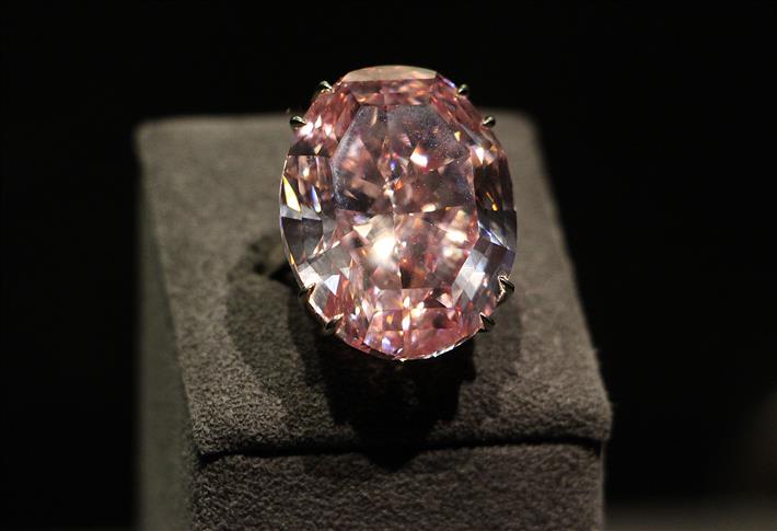 Extracted from African mines, the pink diamond, considered one of the worlds most unique gems was trimmed over two year from a rough gemstone weighing 132.5 carats by expert cutters at Streinmenz Diamonds Company.