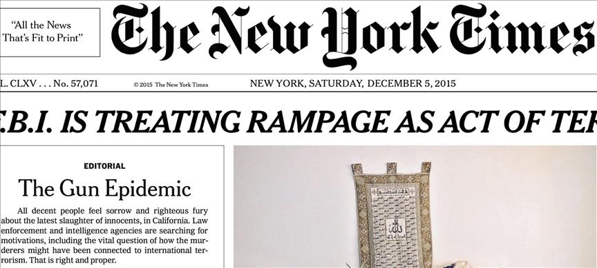 The publisher of the newspaper, Arthur Sulzberger Jr, said in a statement that the paper's decision to place the editorial on the Page 1 aimed at delivering "a strong and visible statement of frustration and anguish about our country’s inability to come to terms with the scourge of guns”.