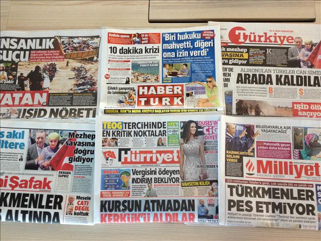 Above its headline “Iraq on the brink of sectarian war,” daily YENI SAFAK quoted Turkey’s Prime Minister Recep Tayyip Erdogan as saying: “This has gone far beyond an encounter with forces affiliated with ISIL. Under current circumstances it can evolve into a sectarian conflict, or maybe even a sectarian war.” Speaking in Turkey’s Black Sea city of Trabzon, Erdogan said, "We cannot underestimate the developments in Tal Afar (a city 50kms west of Mosul). As you all know, it is a Turkmen majority city. Half of our Turkmen brothers are Sunni Muslims, the other half are Shia Muslims."