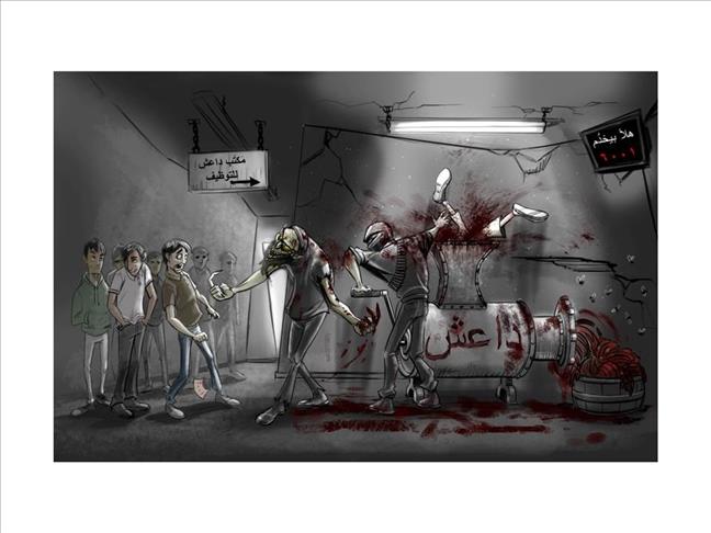 A ghoulish-faced man urges a frightened recruit to move forward as another man turns a meat grinder labeled “Daesh.” Two legs are visible above the machine’s feeder tube as a second man pushes an individual through the machine that is spewing out bloodied remains into a barrel.