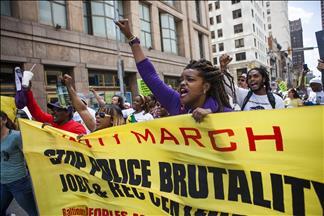 About 1,000 demonstrators marched in the city while hundreds of police officers created a human barrier around protesters.