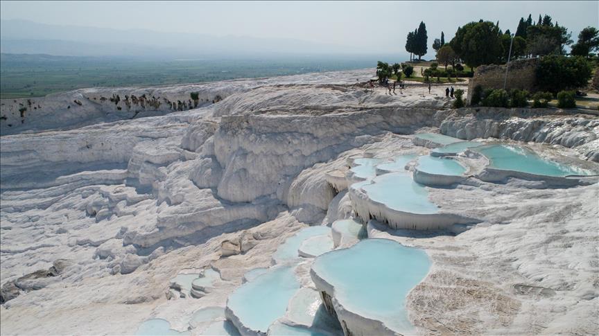 Su paisaje único y su gran historia han hecho de Pamukkale uno de los lugares turísticos más relevantes en Turquía con miles de visitantes cada año subiendo la cima de la montaña blanca para contemplar desde su altura la belleza del valle calmo, donde a la distancia los automóviles no parecen emitir ningún sonido.