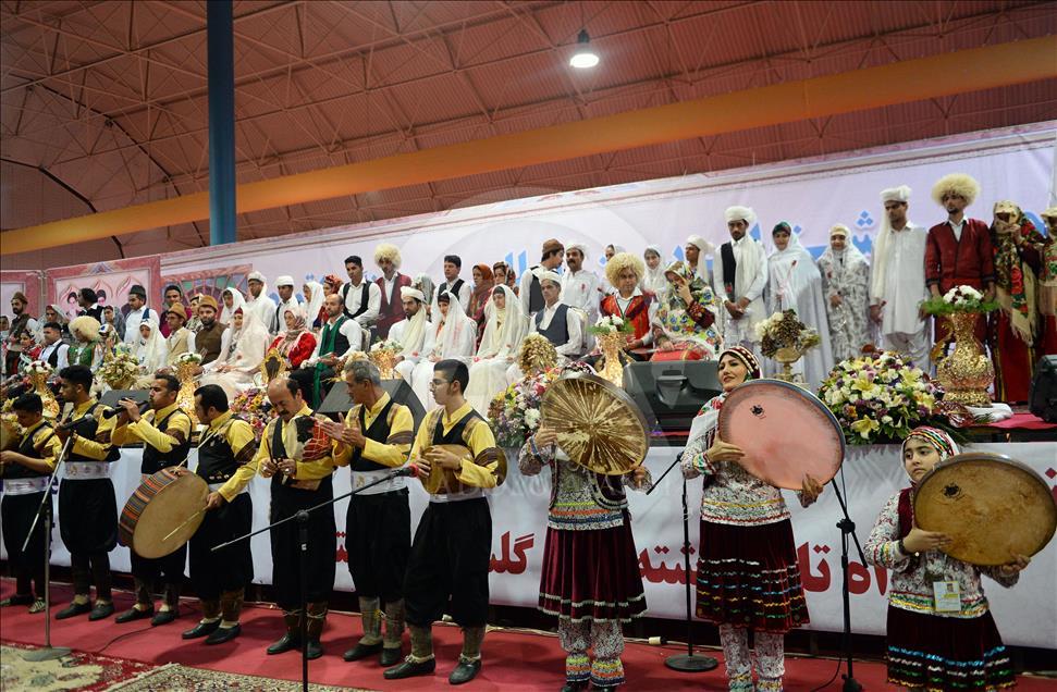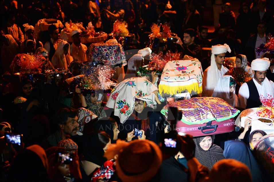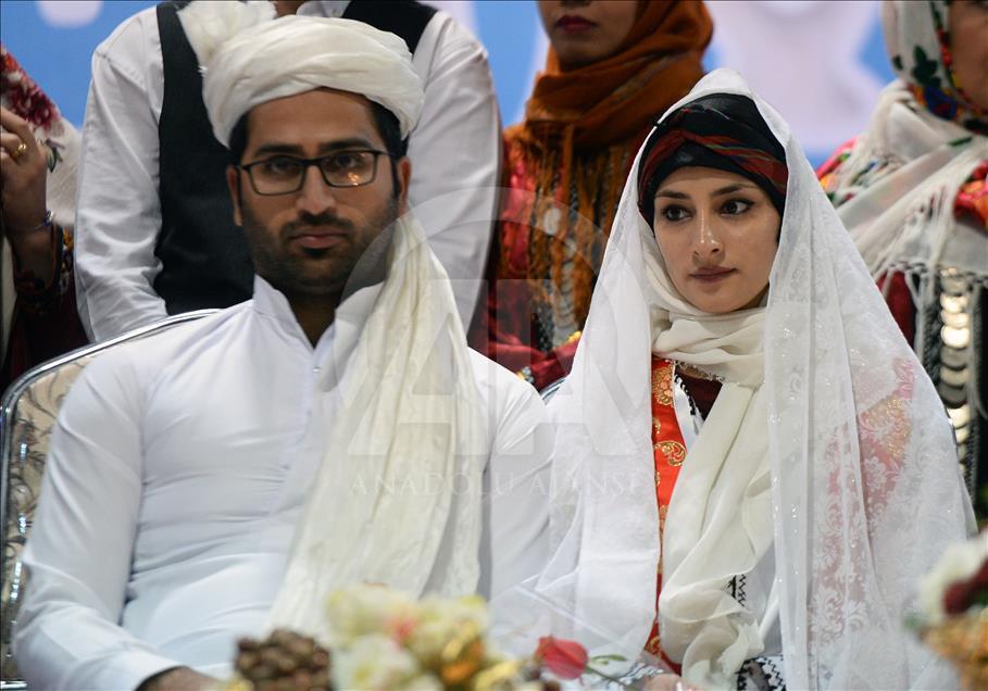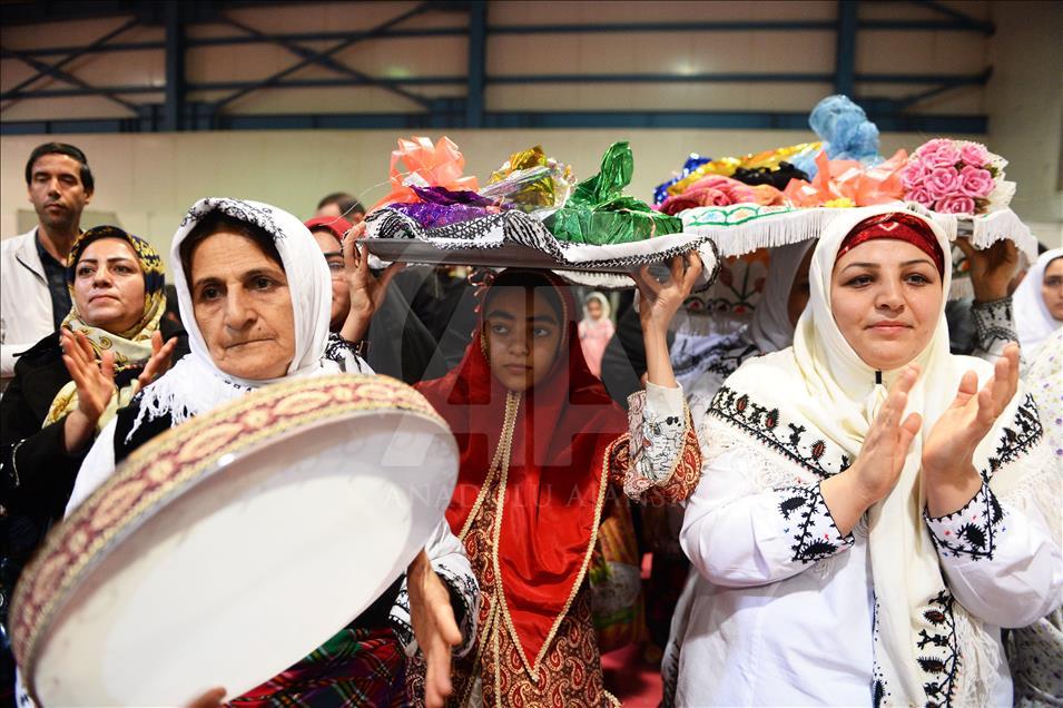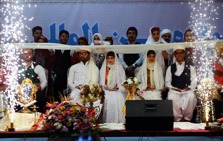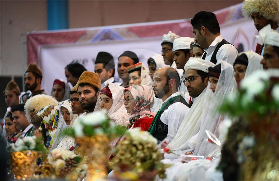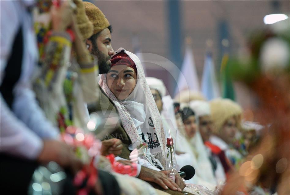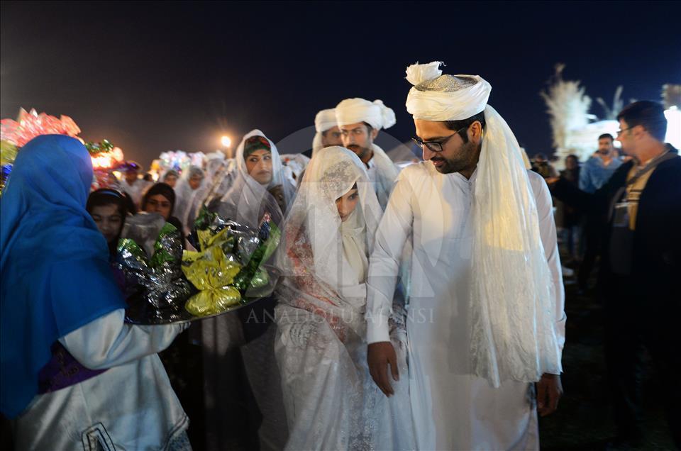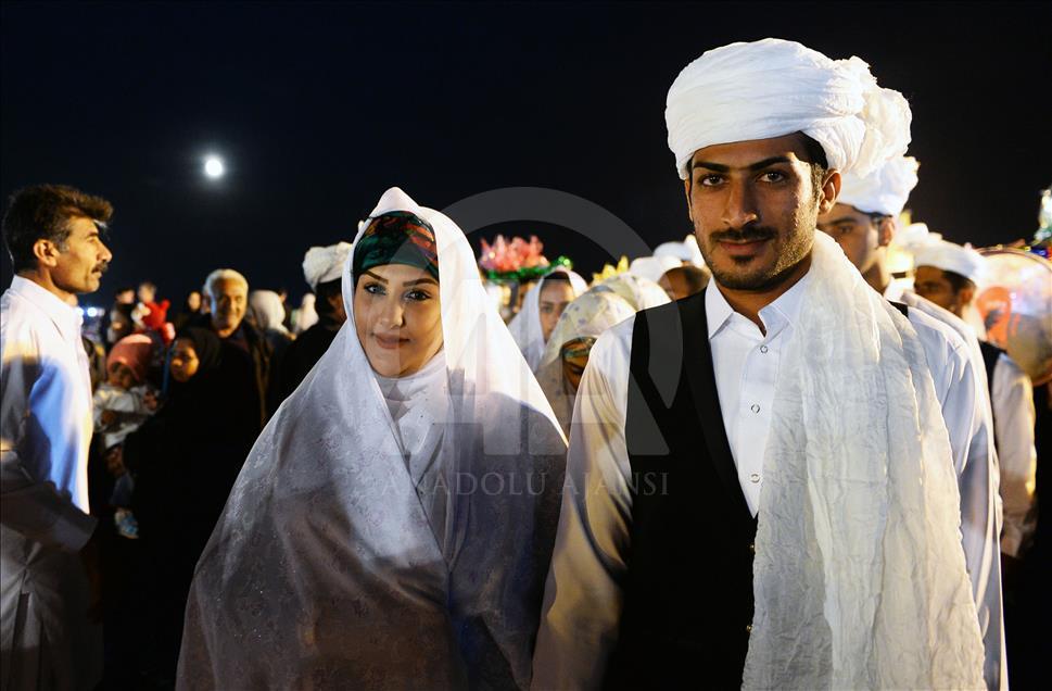La ceremonia nupcial colectiva llenó de color, alegría y fiesta la noche iraní. 25 parejas entre ellas, turcomanos, persas, kurdos y otros grupos étnicos, sellaron su compromiso en esta boda celebrada en el estado de Golestán, en el noreste de Irán. En Golestán, Irán el 22 de noviembre de 2018.