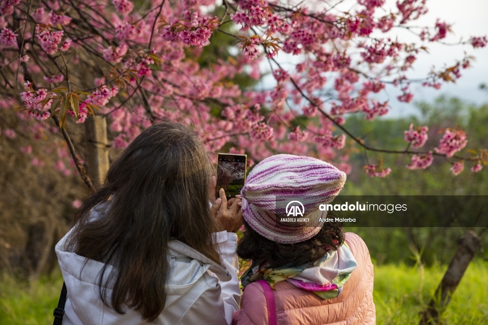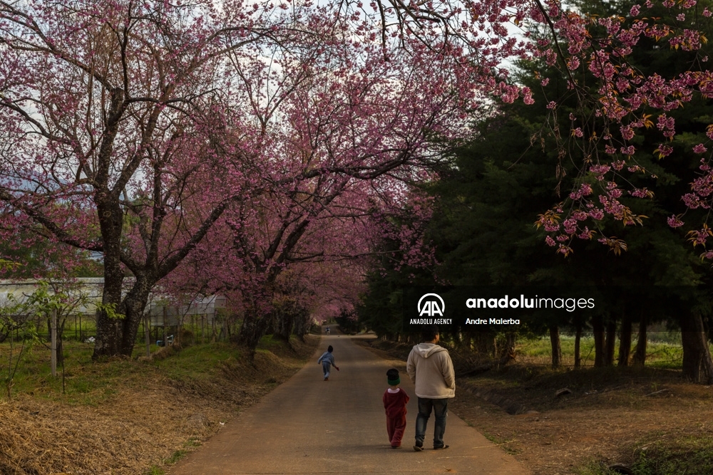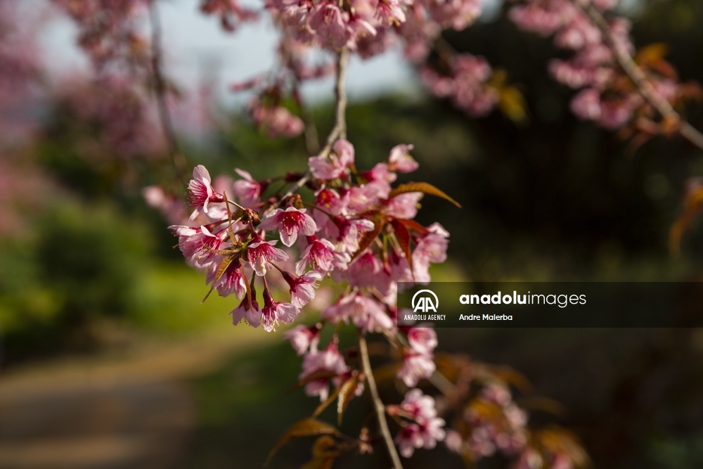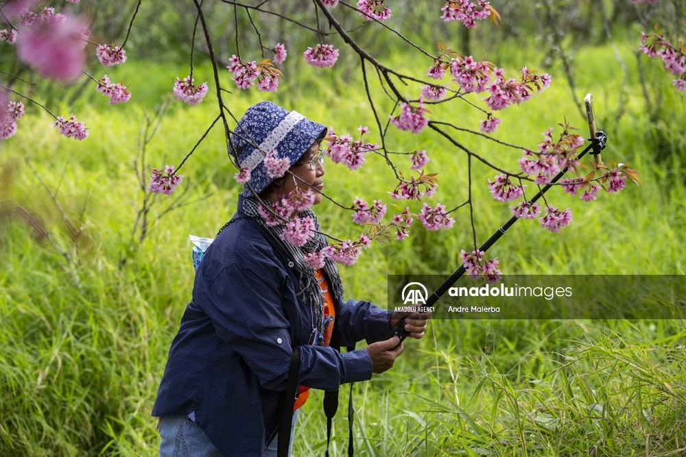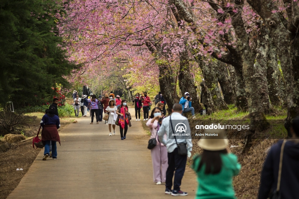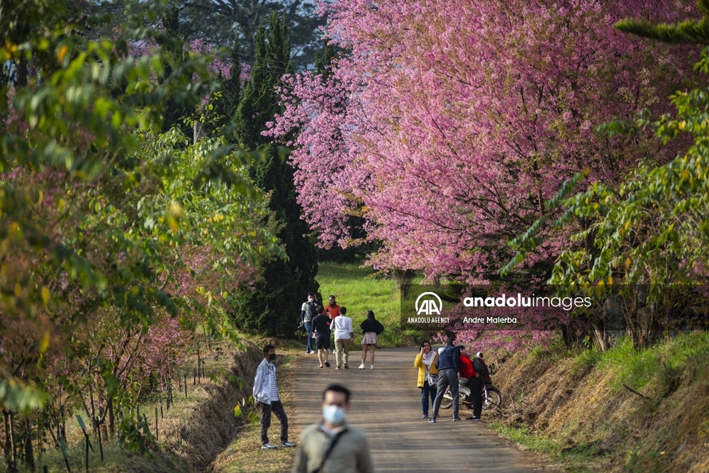 Turistas recorren un jardín de cerezos del Himalaya en Chiangmai, Tailandia, el 14 de enero de 2022. Tailandia tiene los primeros florecimientos de cerezos en el mundo cada año, en el llamado Khun Wang Royal Agricultural Proyect, creado por el difunto rey Bhumibol Adulyadej.