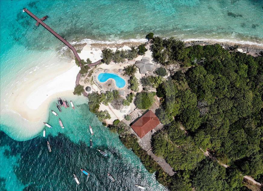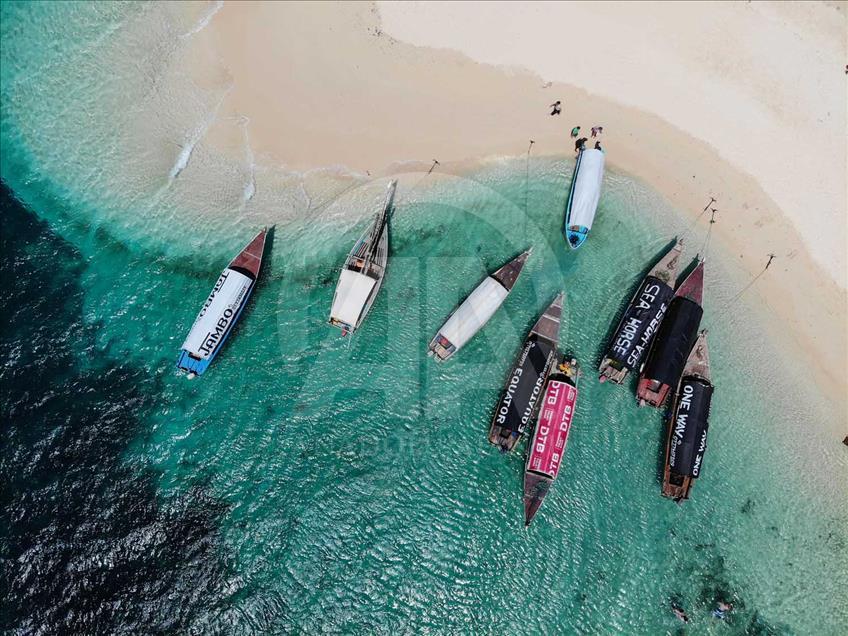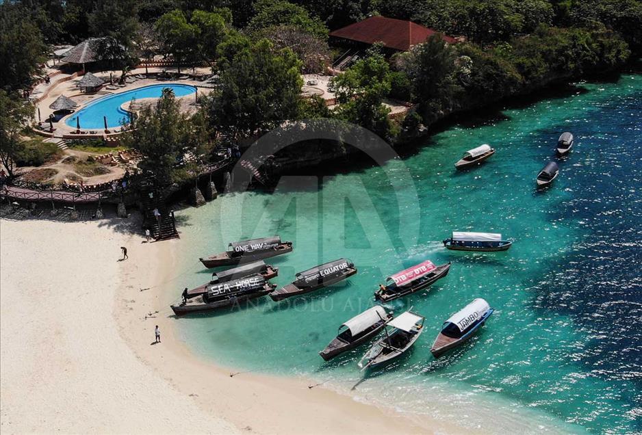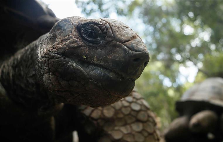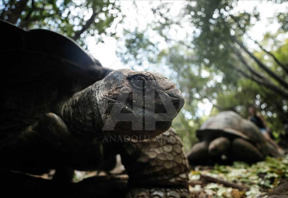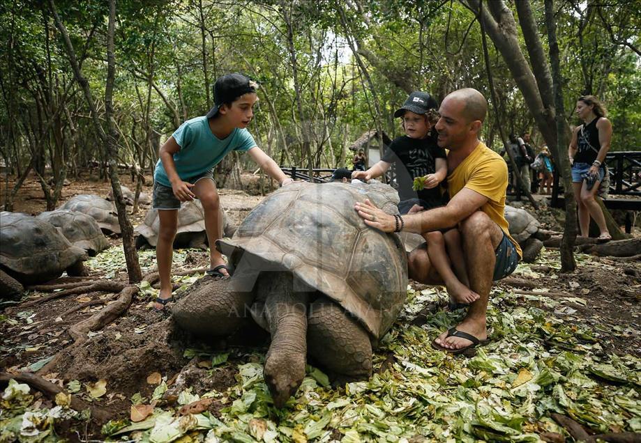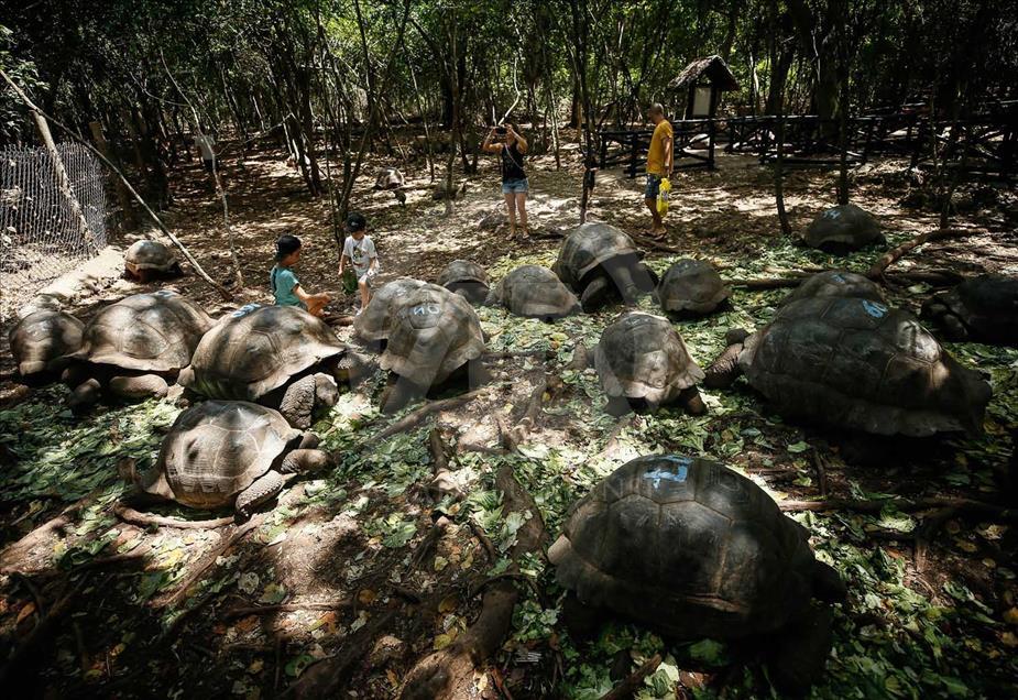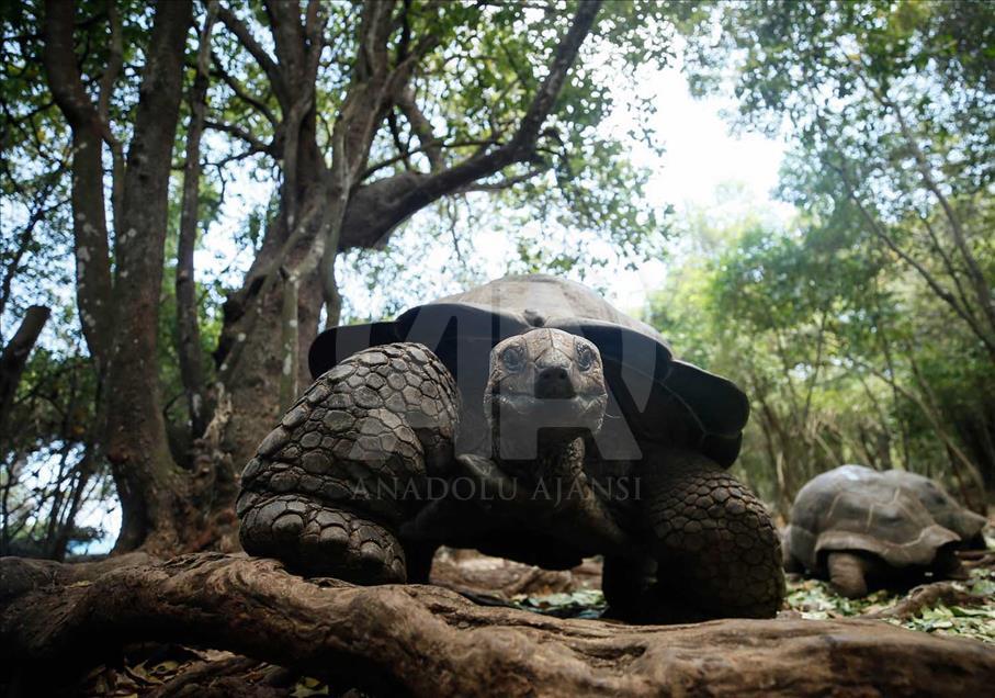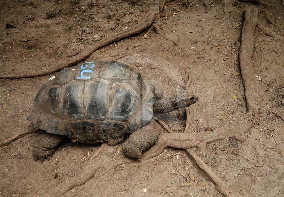 Tortugas gigantes en la isla Changuu (también conocida como isla de la prisión) en Zanzibar, Tanzania el 20 de agosto de 2018. En la isla habitan tortugas gigantes de Aldabra (Aldabrachelys gigantea), una de las más grandes del mundo. A finales del siglo XIX, la isla se convirtió en un centro de cuarentena de Zanzíbar, Kenia, Uganda y Tanganica después del brote de la peste bubónica o «muerte negra».