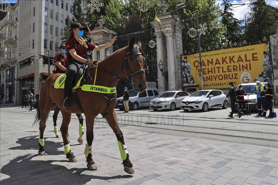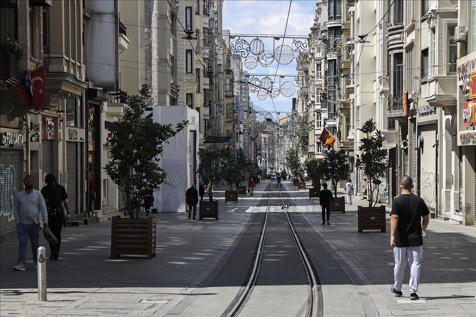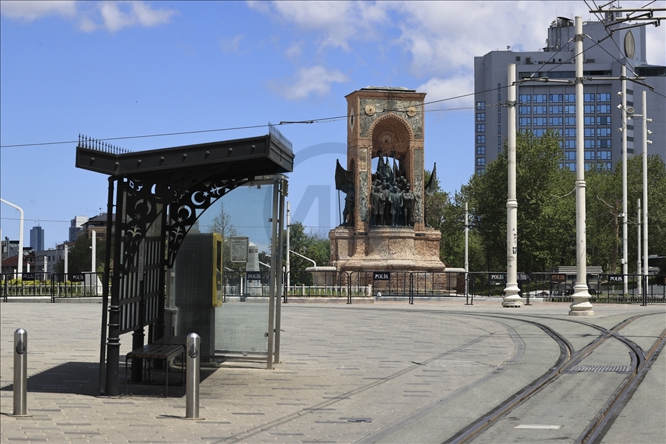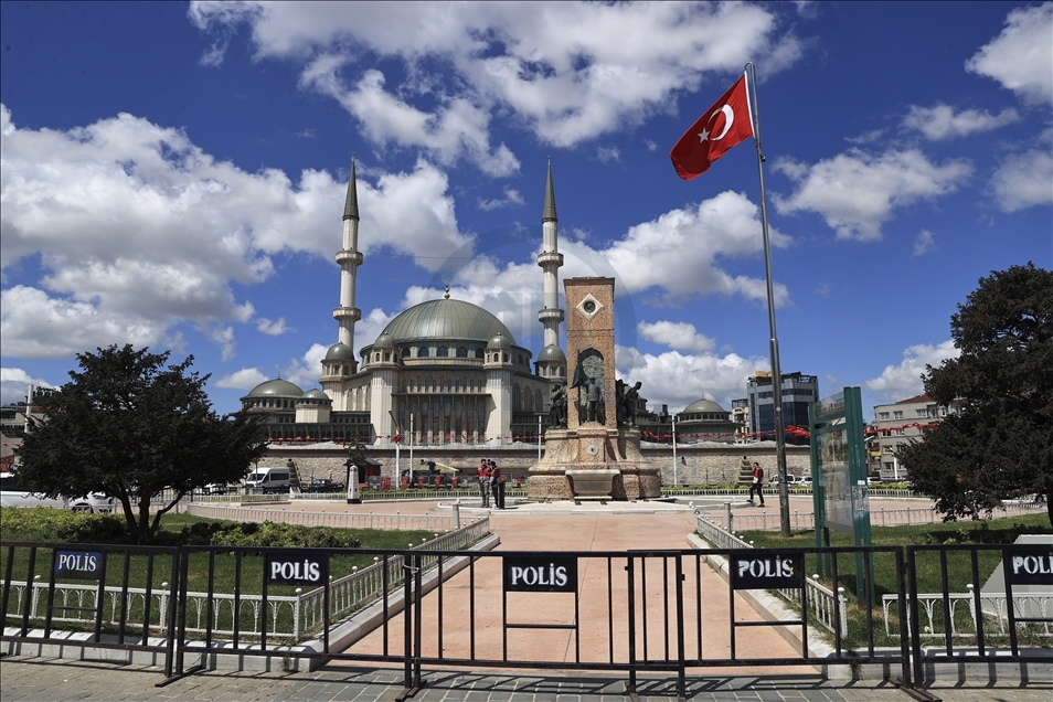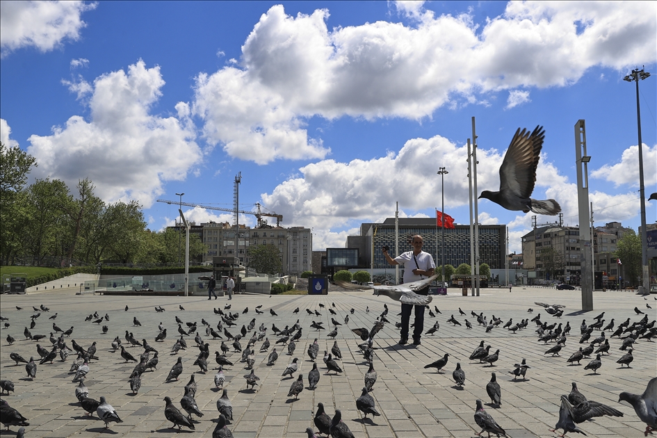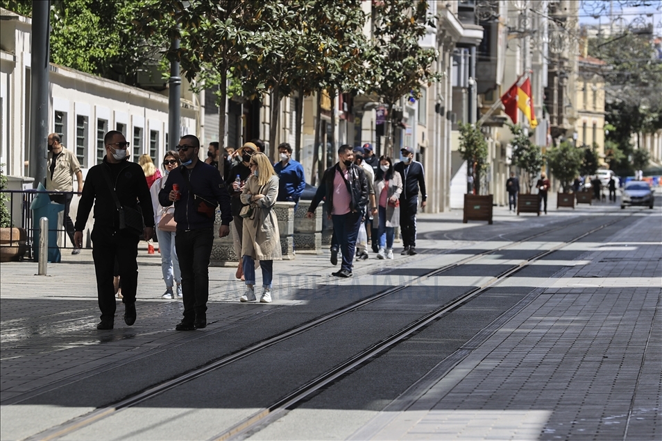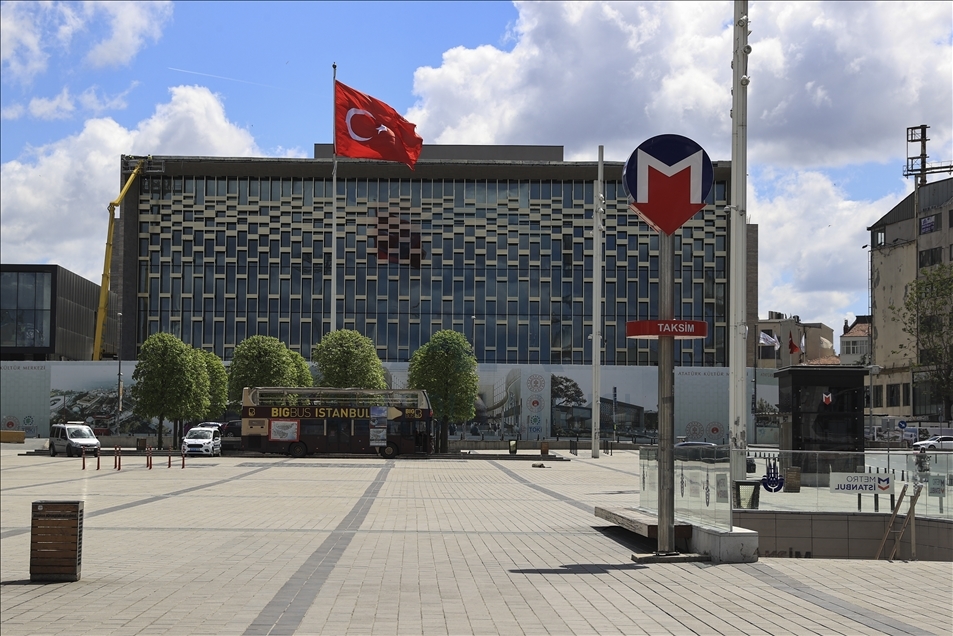 Los turistas, exentos del toque de queda, recorren la plaza Taksim durante el bloqueo total que dura hasta el 17 de mayo, para detener la propagación de la pandemia del coronavirus en Estambul, Turquía, el 9 de mayo de 2021.