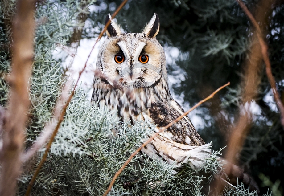 Imágenes de búho chico o de 'orejas largas' en un árbol en el pueblo de Beyobasi, del distrito de Sincan, Ankara, Turquía el 14 de diciembre de 2020. Casi 30 búhos de orejas largas del bosque viven en el pueblo turco.Emin Sansar