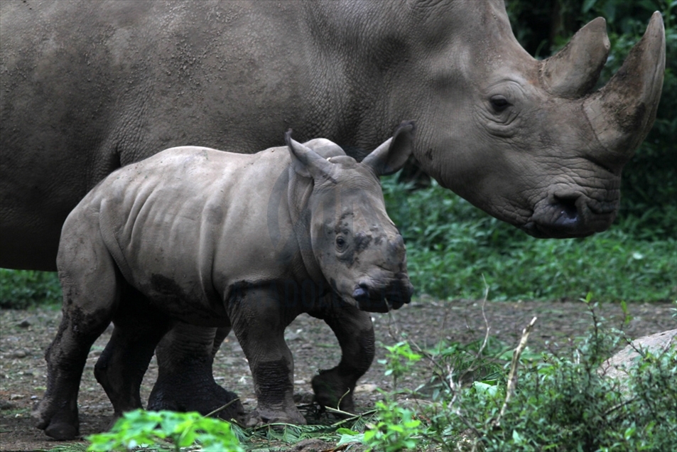 Un ternero de rinoceronte blanco (Ceratotherium simum) llamado Azsyifa, es visto en el área de Taman Safari Indonesia, Cisarua, Bogor, Java Occidental, Indonesia, el 23 de enero de 2021. El rinoceronte blanco nació de la madre Chuma y el padre Merdeka, que se suma a otros cuatro mamíferos de su especie.Eko Siswono Toyudho