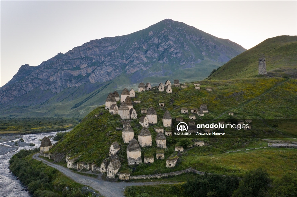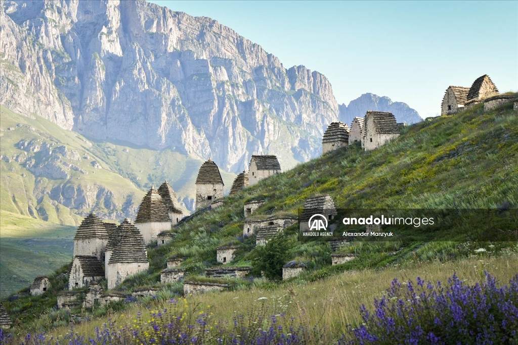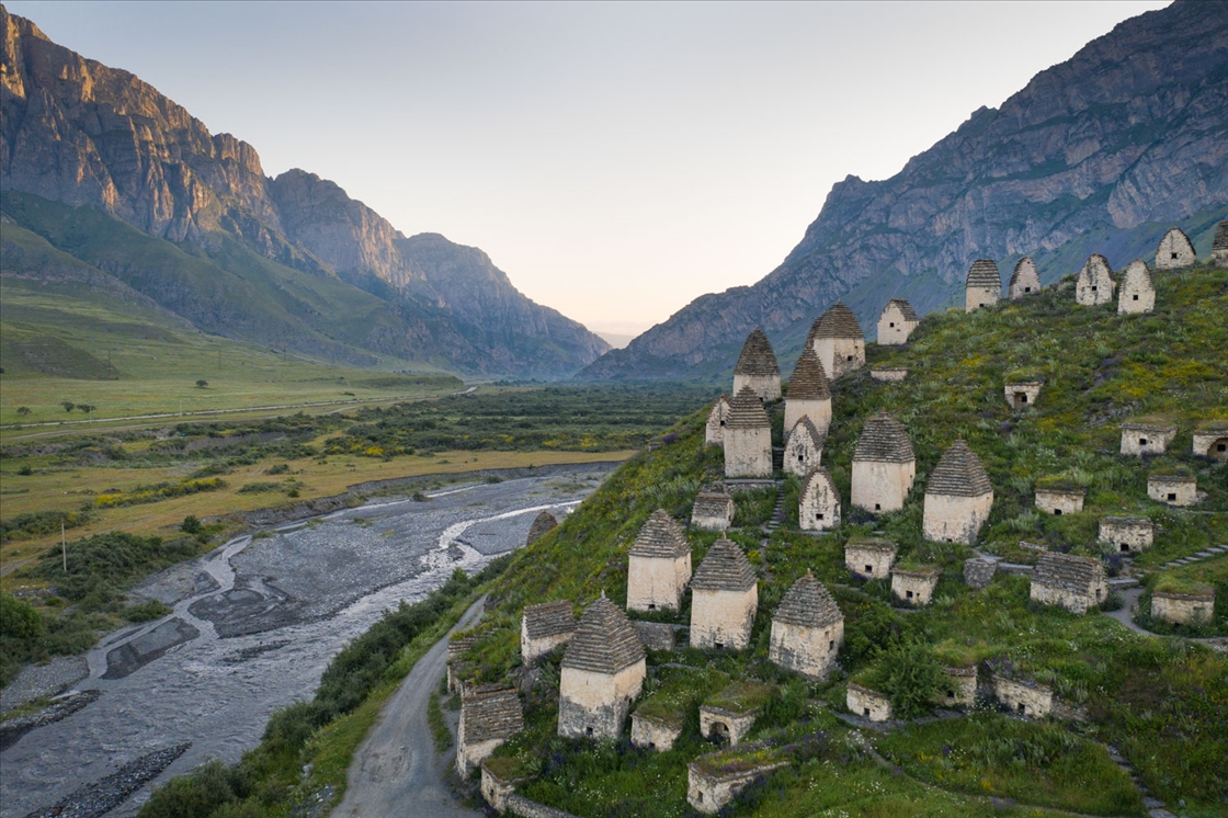 Imágenes de la necrópolis más grande del Cáucaso ubicada en una colina verde, donde los residentes enterraron a sus familiares en pequeñas criptas, en Dargavs, Osetia, Rusia, el 16 de agosto de 2022. En total, hay alrededor de 97 criptas en Dargavs, que está bajo la protección de la UNESCO.