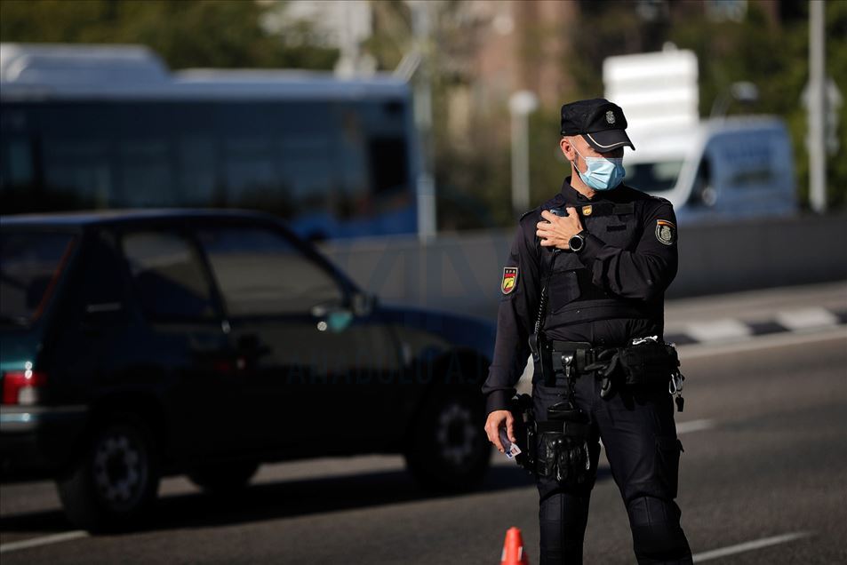 Un grupo de oficiales de Policía realizan controles de seguridad debido a las restricciones a los viajeros durante las nuevas restricciones que entraron en vigencia por el aumento de los casos de coronavirus (COVID-19) en la ciudad de Madrid, España, octubre 06, 2020.Burak Akbulut