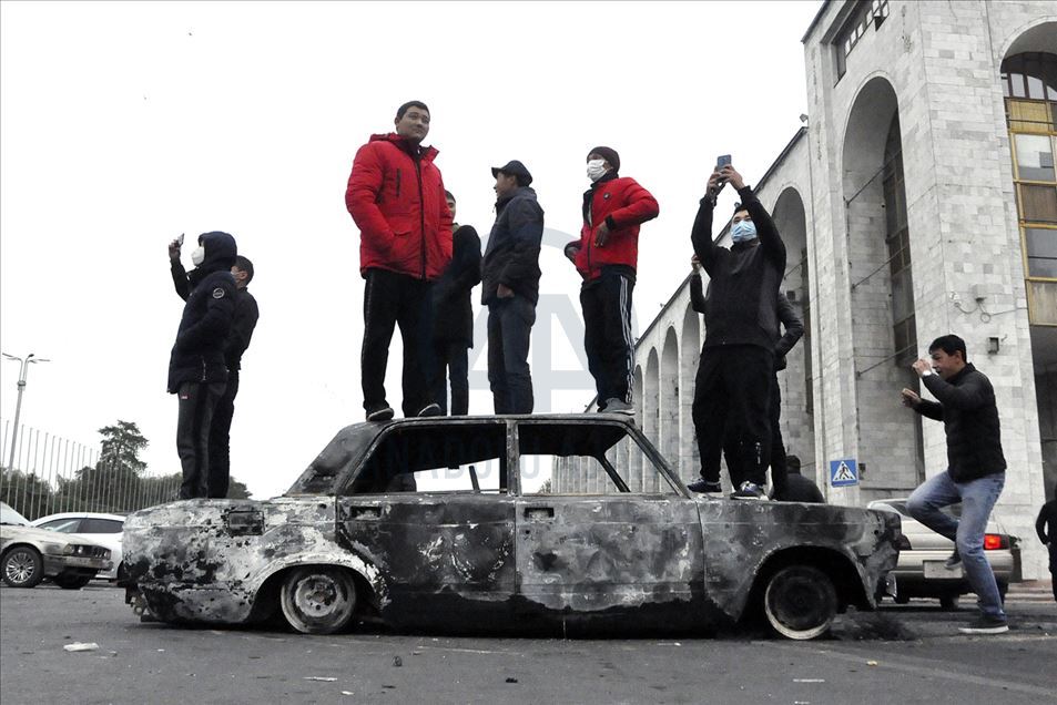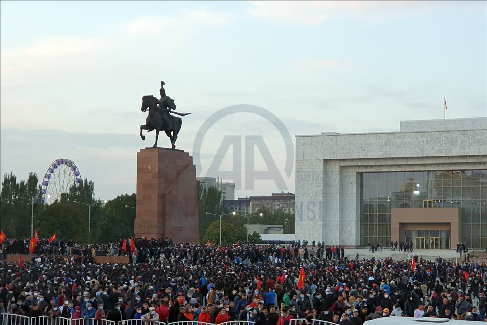 Un grupo de manifestantes continúa protestando alrededor del Palacio Presidencial, el cual ocuparon esta noche, después de conocer los resultados de las elecciones parlamentarias del fin de semana, en Ala-Too Square, en Bishkek, Kirguistán, el 6 de octubre, 2020.Cengiz Buyar